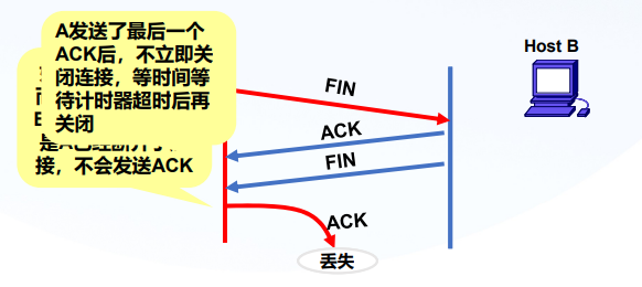 在发送了最后一个ACK后,不立即关闭连接,而是等待一段时间,保证能 接收到重复的FIN数据段