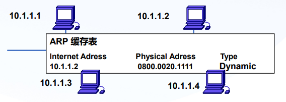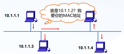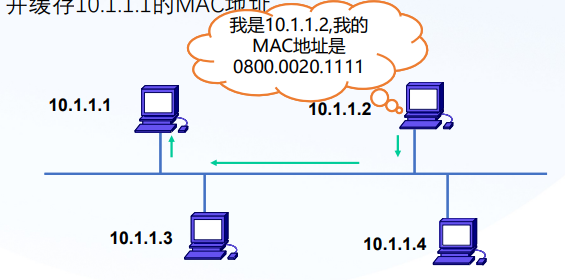 - 所有主机都接收到10.1.1.1的ARP广播,但只有10.1.1.2给他一个单波回复,并缓存10.1.1.1的MAC地址