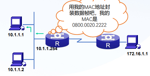- 网关10.1.1.254给10.1.1.1一个单播回复,将自己的接口MAC地址告诉给10.1.1.1