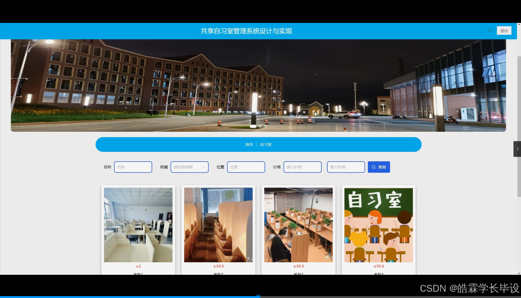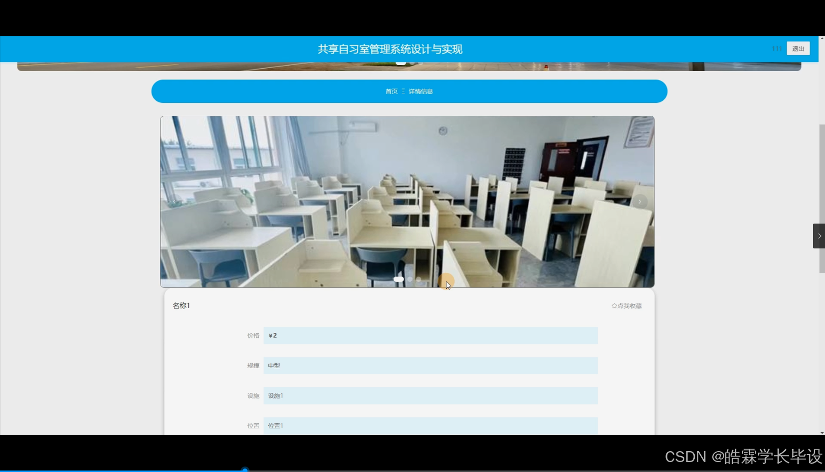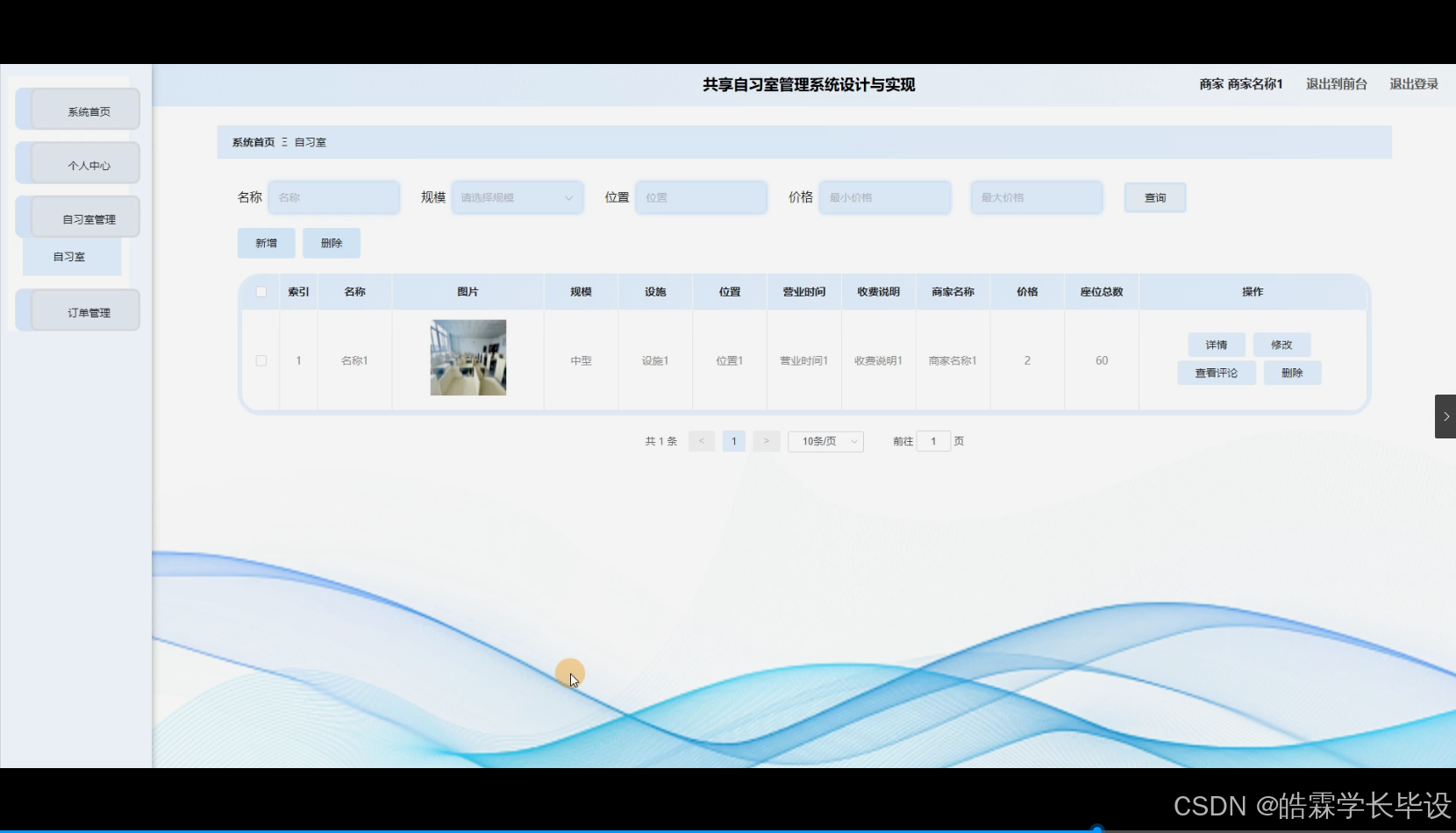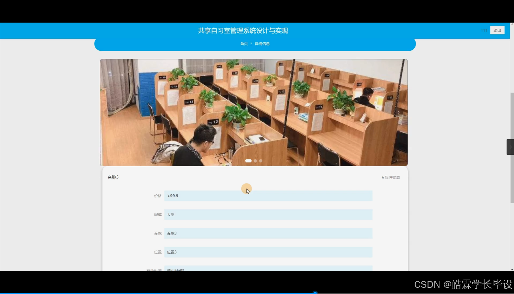 - 自习室运营管理:商家可以添加、删除自习室信息,管理自习室的开放时间、价格策略等。