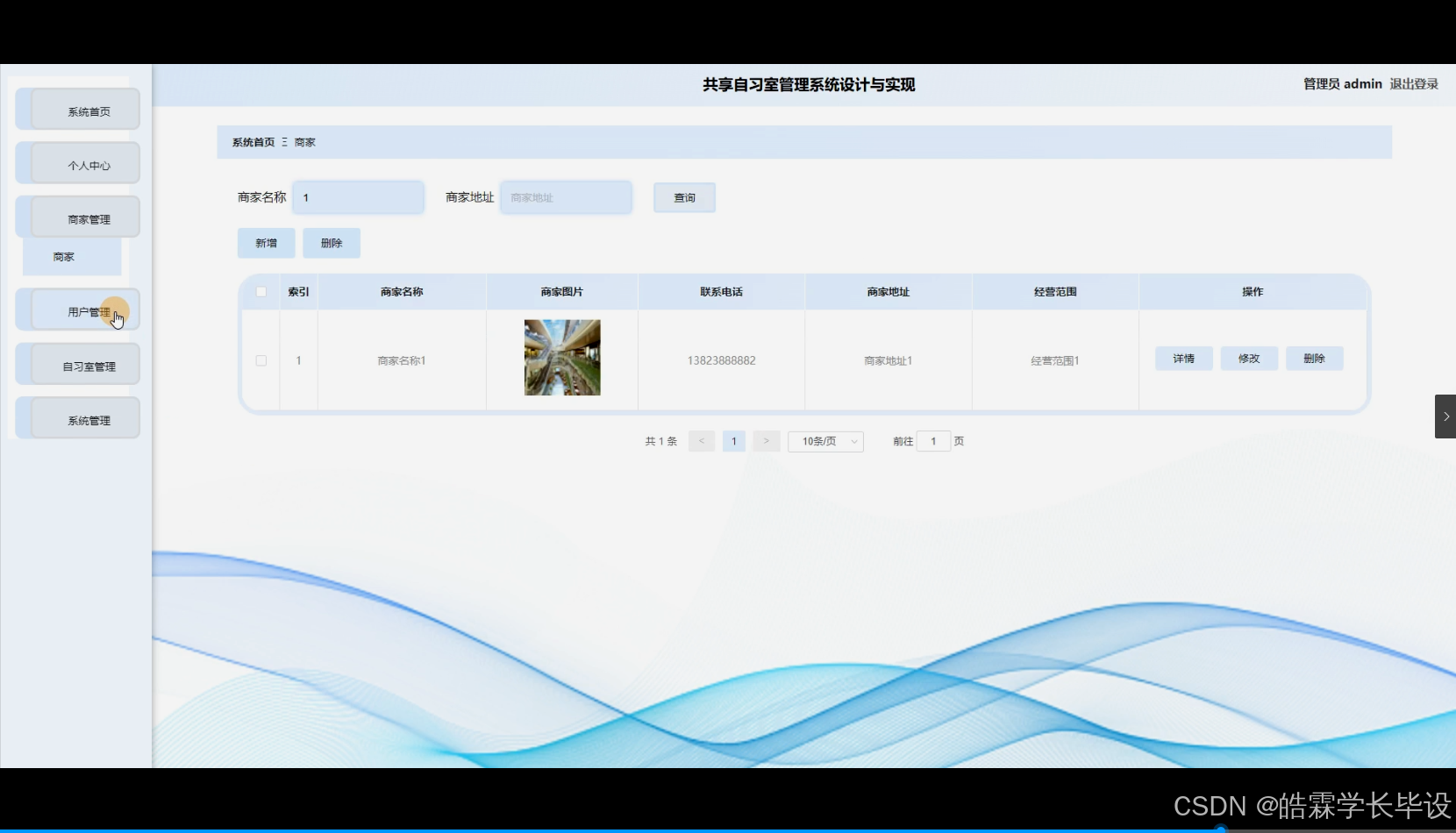 - 完成共享自习室管理系统的设计与实现,包括功能完善的用户端、商家端以及后台管理系统。