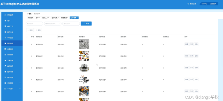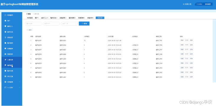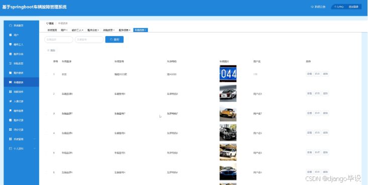 可以查看系统首页、用户、维修工人、配件分类、故障类型、配件信息、车辆信息、故障报修、入库记录、维修信息、配件记录、评价记录、系统管理、个人资料等功能进行详细操作,如图。系统首页、用户、维修工人、配件分类、故障类型、配件信息、车辆信息、故障报修、入库记录、维修信息、配件记录、评价记录、系统管理、个人资料。对车辆品牌、车辆型号、车辆图片、车牌号码、故障类型、预约情况、预约时间、用户名、手机、审核回复、