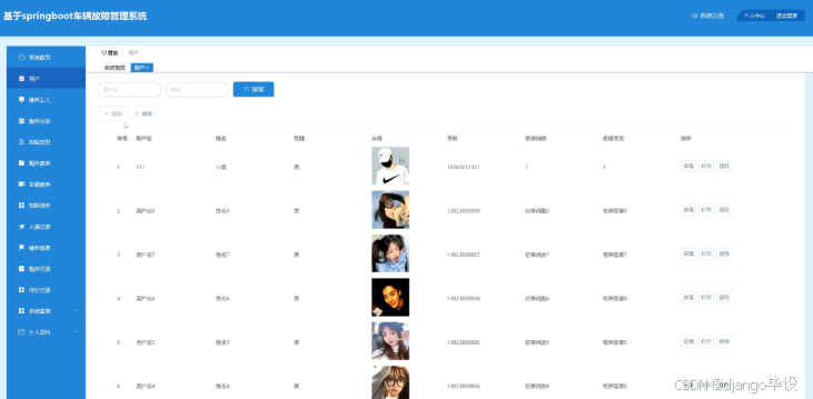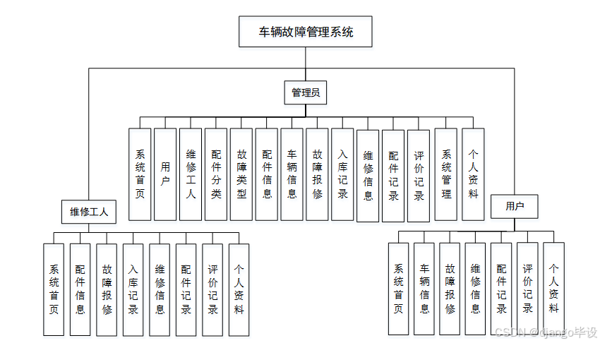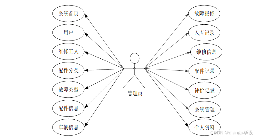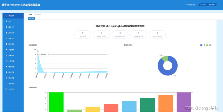 管理员端的功能主要是开放给系统的管理人员使用,能够对、维修工人、用户的信息进行管理,包括对系统首页、用户、维修工人、配件分类、故障类型、配件信息、车辆信息、故障报修、入库记录、维修信息、配件记录、评价记录、系统管理、个人资料进行查看,修改和删除、添加等,对系统整体运行情况进行了解。