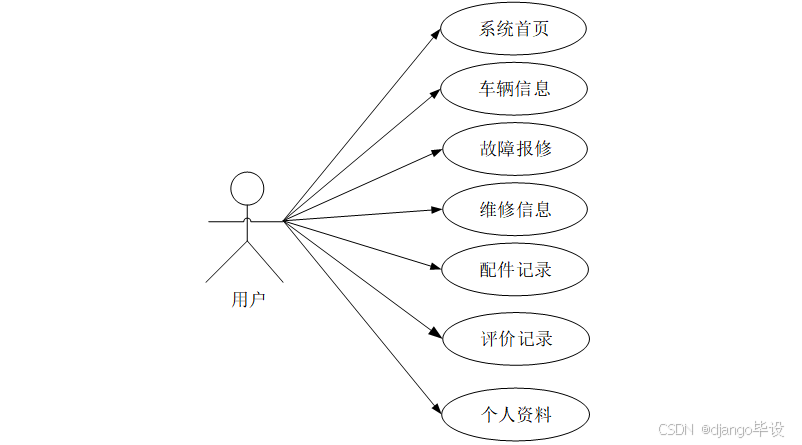 用户的功能主要是对个人账号和密码进行更新管理,对系统首页、车辆信息、故障报修、维修信息、配件记录、评价记录、个人资料进行查询详情操作。