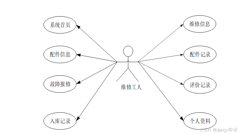 维修工人的功能主要是对个人账号和密码进行更新管理,对系统首页、配件信息、故障报修、入库记录、维修信息、配件记录、评价记录、个人资料进行查询详情操作。