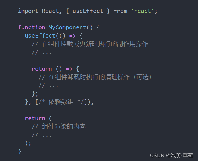 - 如果Effect不依赖任何数据,可以传递一个空数组作为依赖,这样Effect只会在组件挂载和卸载时执行一次。