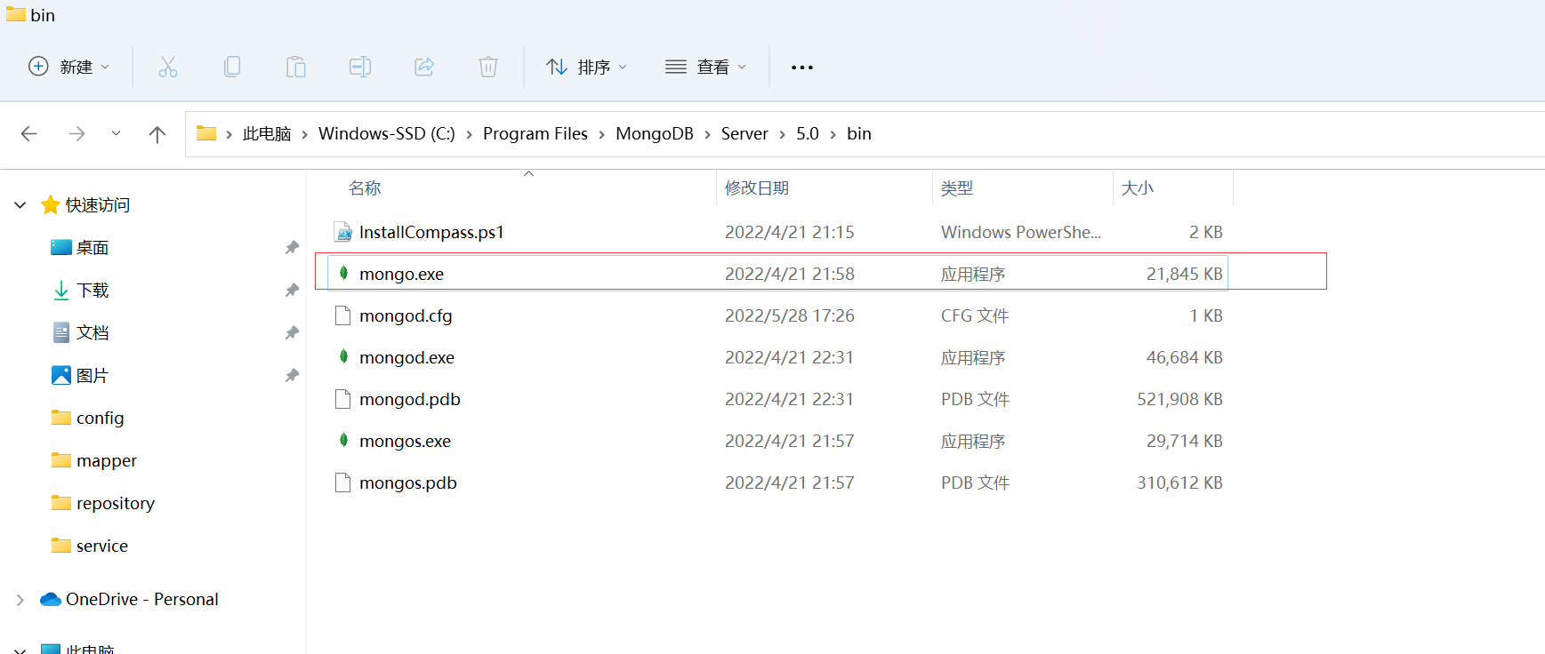 安装后,到安装bin目录下,点击:mongo.exe;