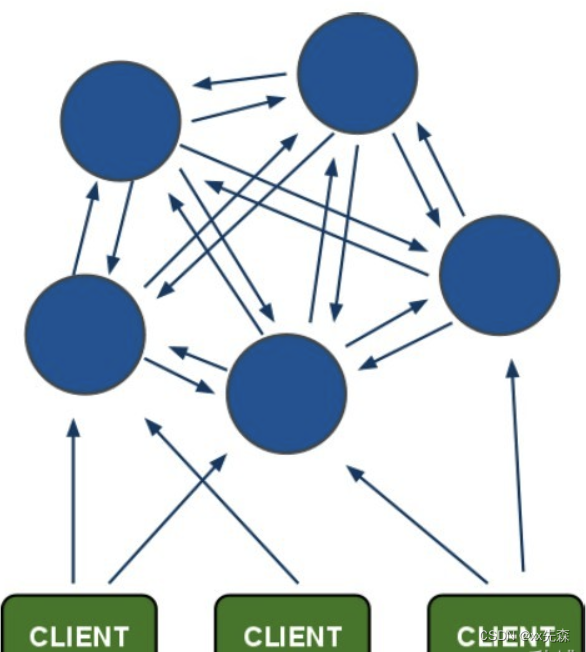 在这个图中,每一个蓝色的圈都代表着一个redis的服务器节点。它们任何两个节点之间都是相互连通的。客户端可以与任何一个节点相连接,然后就可以访问集群中的任何一个节点。对其进行存取和其他操作。