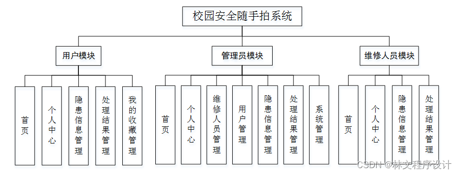 校园安全随手拍系统主要有3类用户。分别是用户模块,维修人员模块和管理员模块,详细规划如图4-1所示。