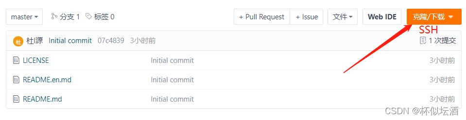 点击克隆菜单 > 选择以SSH协议进行代码的克隆 > 复制 >