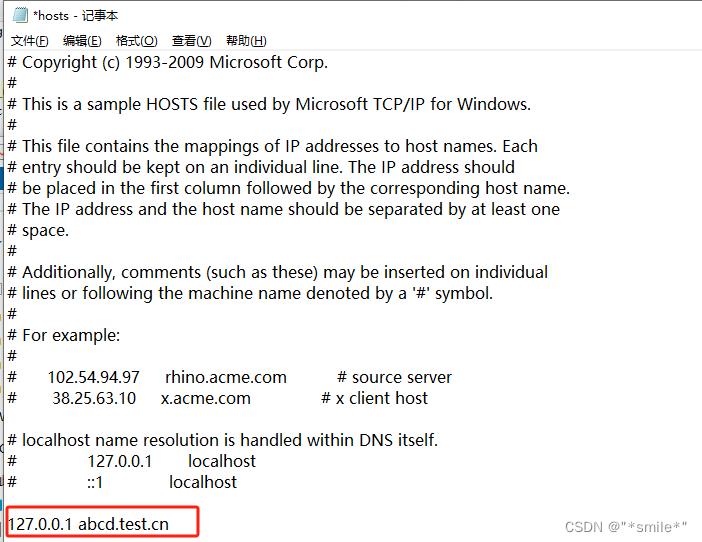 8. 配置域名:C:\Windows\System32\drivers\etc下的hosts文件中添加127.0.0.1 abcd.test.cn