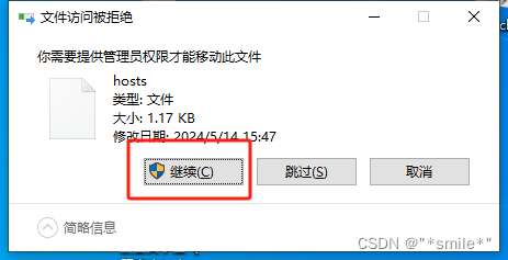 (1)如果提示没有权限更改可以将该文件移动至桌面,改好了再放回去,移动时点击继续;
