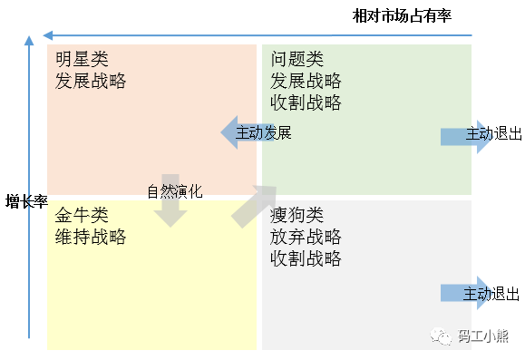 很多咨询公司都喜欢用这种方法,类似KANO模型或者波士顿矩阵,本质就是找到了两个很好的评价指标,通过两指标交叉构造矩阵,对业务分类。分类的区分效果很好,就广为流传了(如下图)。