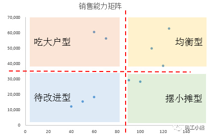 第三步:区分出多客户+高业绩,少客户+高业绩,多客户+低业绩,少客户+低业绩四类