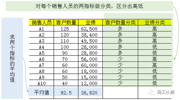 第二步:利用平均值,对每个销售人员的客户数量、业绩进行分类
