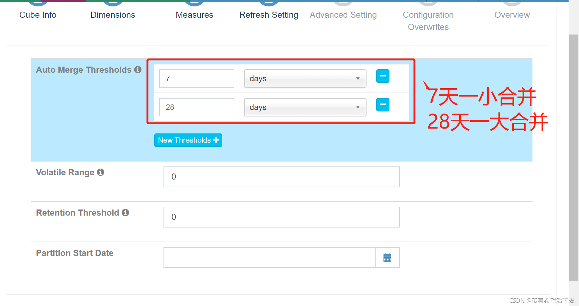 cube自动合并设置,cube需按照日期分区字段每天进行构建,每次构建的结果会保存在Hbase中的一张表内,为提高查询效率,需将每日的cube进行合并,此处可设置合并周期。