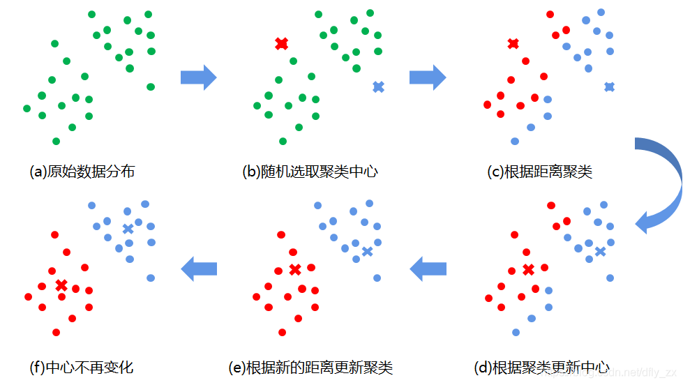 6、重复步骤3-5直到收敛(中心点不再变化)