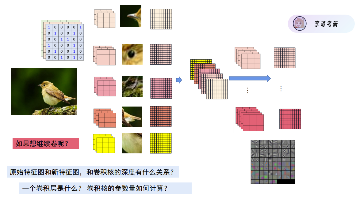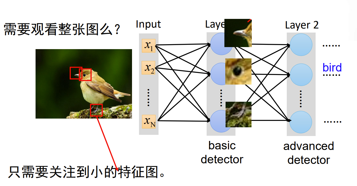 当我们判断图片上是否是一只小鸟的时候,我们不必观看整张图片,只需关注到小的特点(特征图),如鸟喙,眼睛,爪子等,便可以判断出这是鸟了。如果我们把图片看作是特征图,那么鸟喙,眼睛,爪子这些特点就是卷积核了。