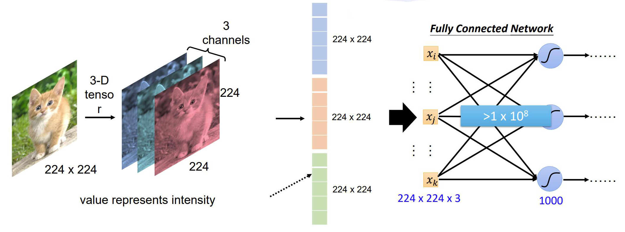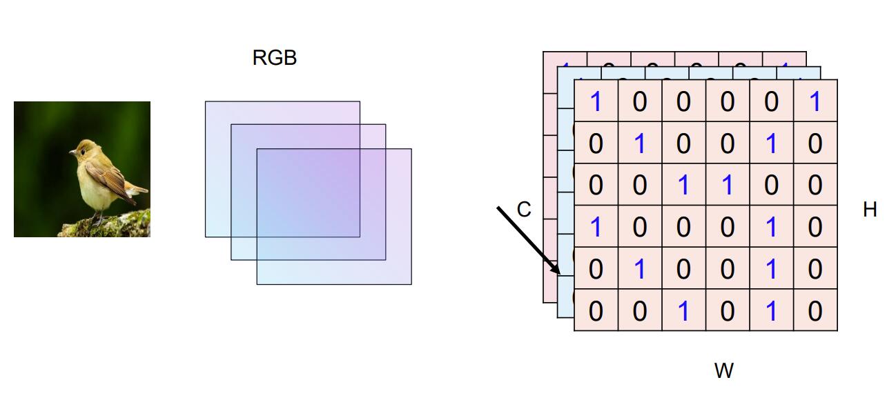 输入图片,我们通常将图片设置为224*244像素大小,并且该图像有 3 个通道(RGB 三色通道),并对应了一个3*244*244大小的矩阵,矩阵中每个值代表该位置像素的强度(颜色值)。得到输入值后如何变为类别的数量呢,毕竟输入有3*244*244个数值,而我们仅有着1000个类别。如果直接使用全连接的方式,就会产生相当多的参数,而且容易出现过拟合的情况。因此我们放弃使用这种方法,并引入一种新的神经网络——卷积神经网络。