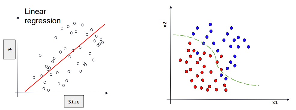 与之前学习到的回归任务不同的是,分类的输出是离散的类别标签(“猫”“狗”),而不是具体的数值。如下图所示,回归任务的模型结构会拟合数据的整体趋势以预测输出值,而分类任务的模型是为了将样本划分为不同的类别区域。
