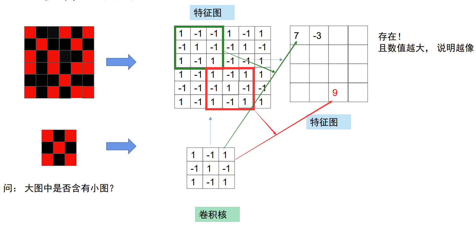 我们来举一个简单的例子,如果我们想知道大图中是否存在小图,应该怎么办呢?对于人来说可以用小图从第一行开始滑动对比,那这种方式应该如何通过机器实现呢?