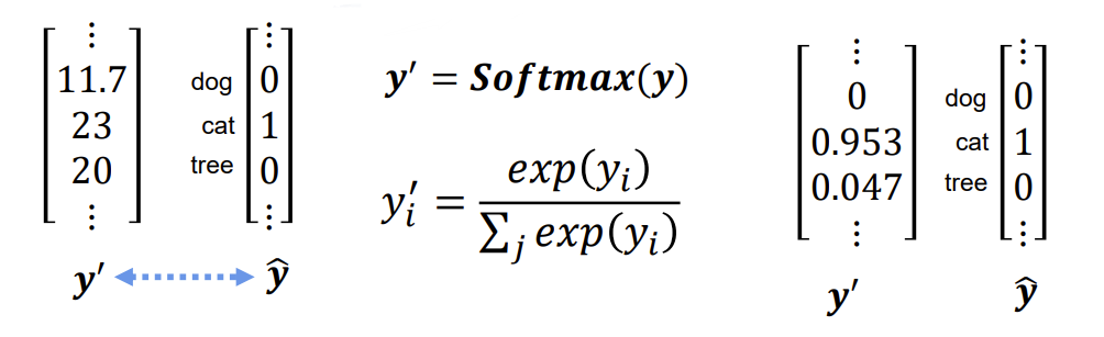 y d o g = e 11.7 e 11.7 + e 23 + e 20 ≈ 0 y c a t = e 23 e 11.7 + e 23 + e 20 ≈ 0.953 y t r e e = e 20 e 11.7 + e 23 + e 20 ≈ 0.047 y_{dog} = \frac{e^{11.7}}{e^{11.7}+e^{23}+e^{20}} \approx 0 \\\quad\\ y_{cat} = \frac{e^{23}}{e^{11.7}+e^{23}+e^{20}} \approx 0.953 \\ \quad\\ y_{tree} = \frac{e^{20}}{e^{11.7}+e^{23}+e^{20}} \approx 0.047 ydog=e11.7+e23+e20e11.7≈0ycat=e11.7+e23+e20e23≈0.953ytree=e11.7+e23+e20e20≈0.047