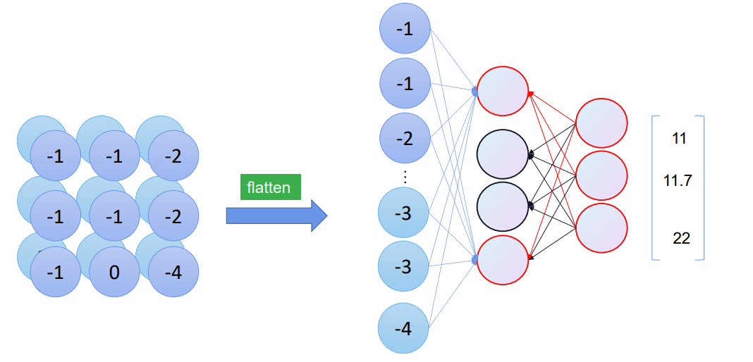 这种多维的矩阵,如何才能卷积,卷成几个类别呢?我们可以将他拉直,最初由于特征图太大,参数太多,需要进行卷积。将其拉直后,再进行全连接。