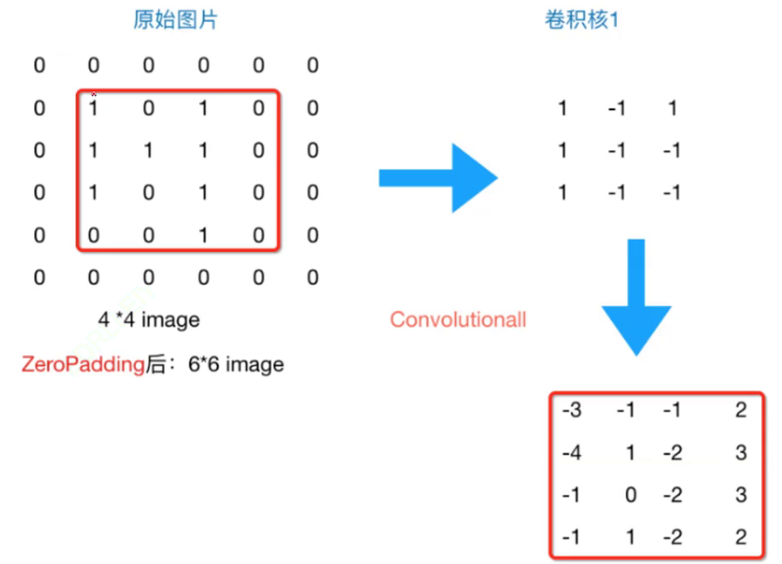 如图所示,原本4*4的特征图,在经过Padding(1)后,变为6*6的特征图,此时经过卷积操作后,得到的新特征图,仍为4*4大小