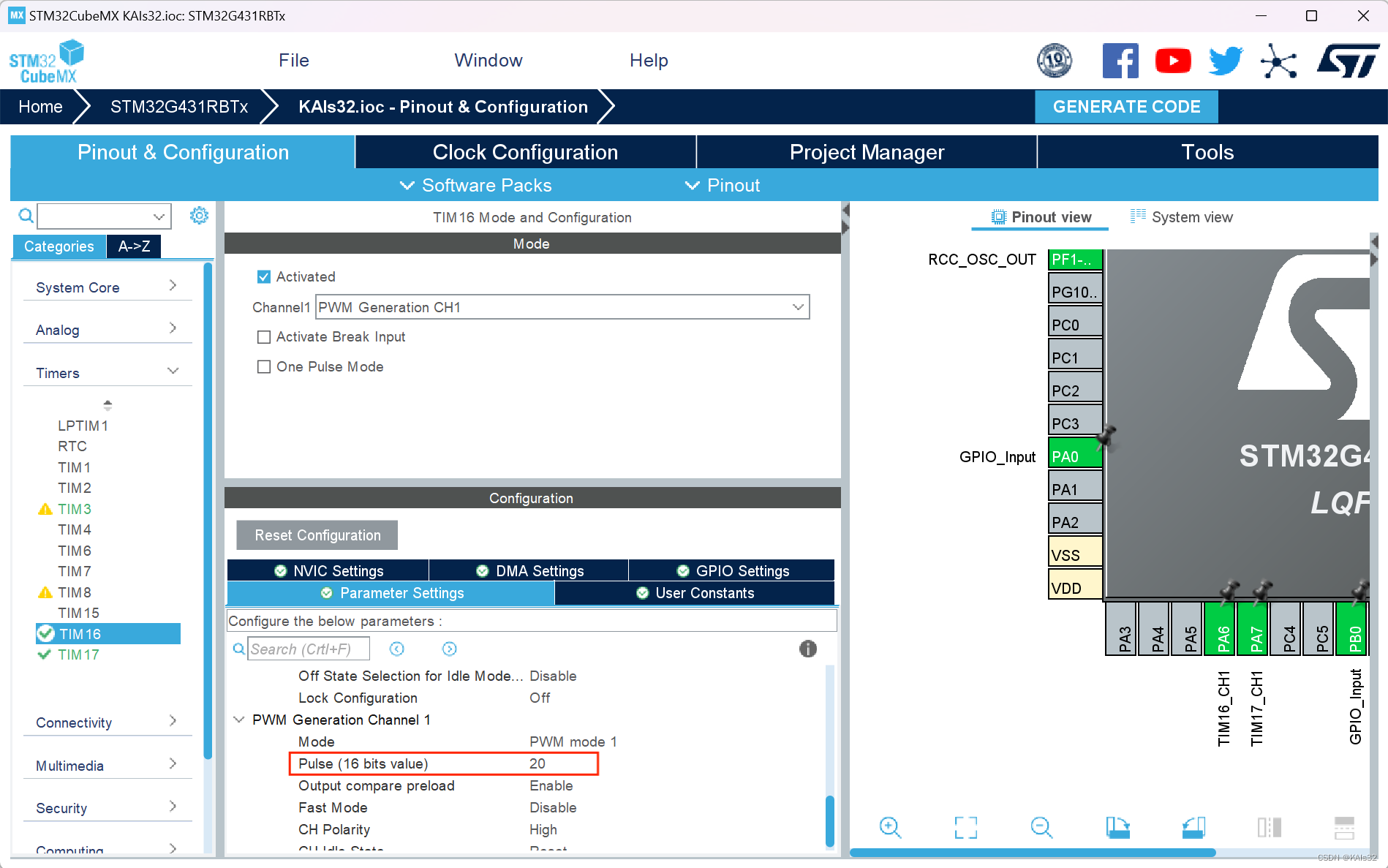 由上图可知,将PA6设置为TIM16_CH1,PA7设置为TIM17_CH1