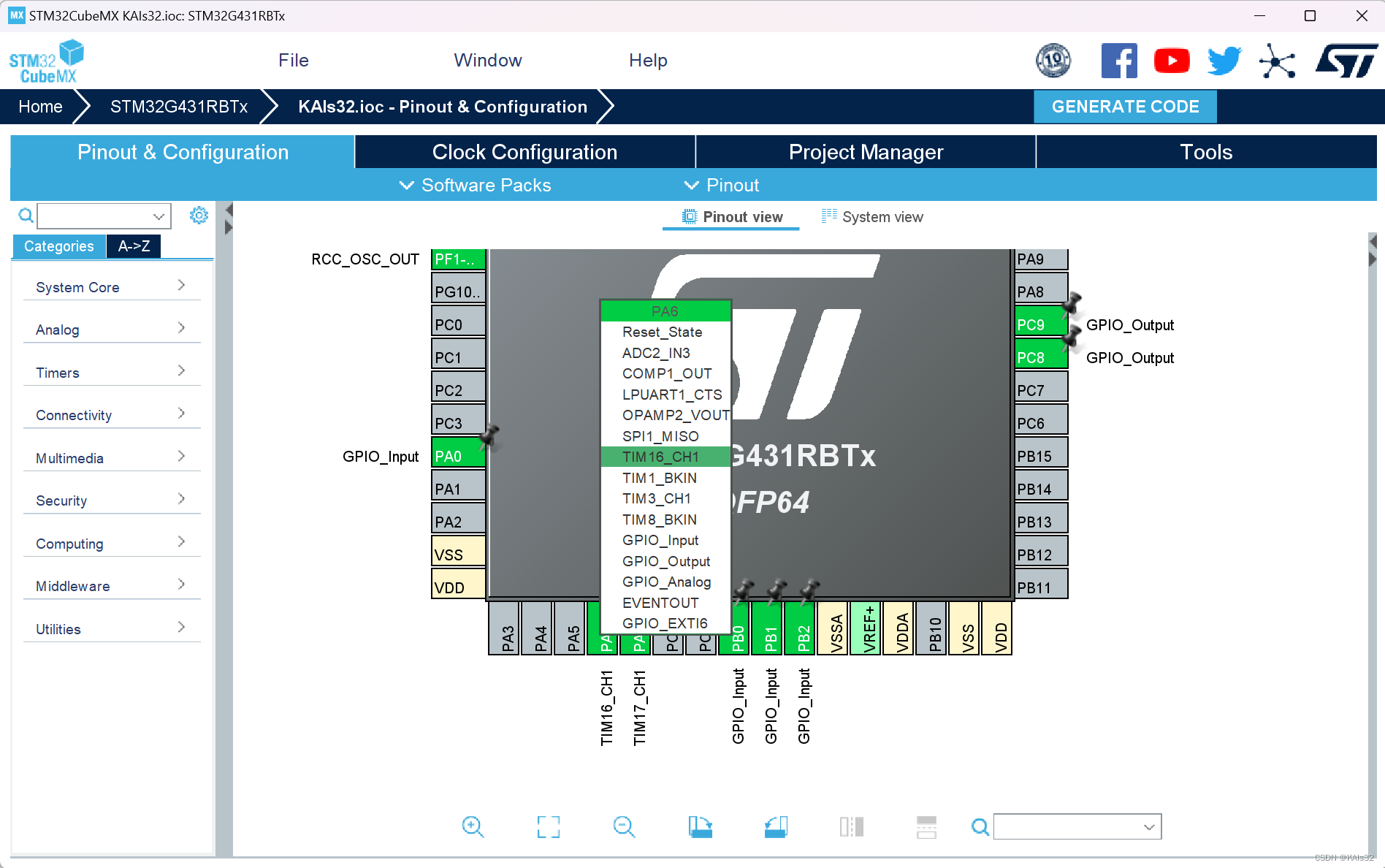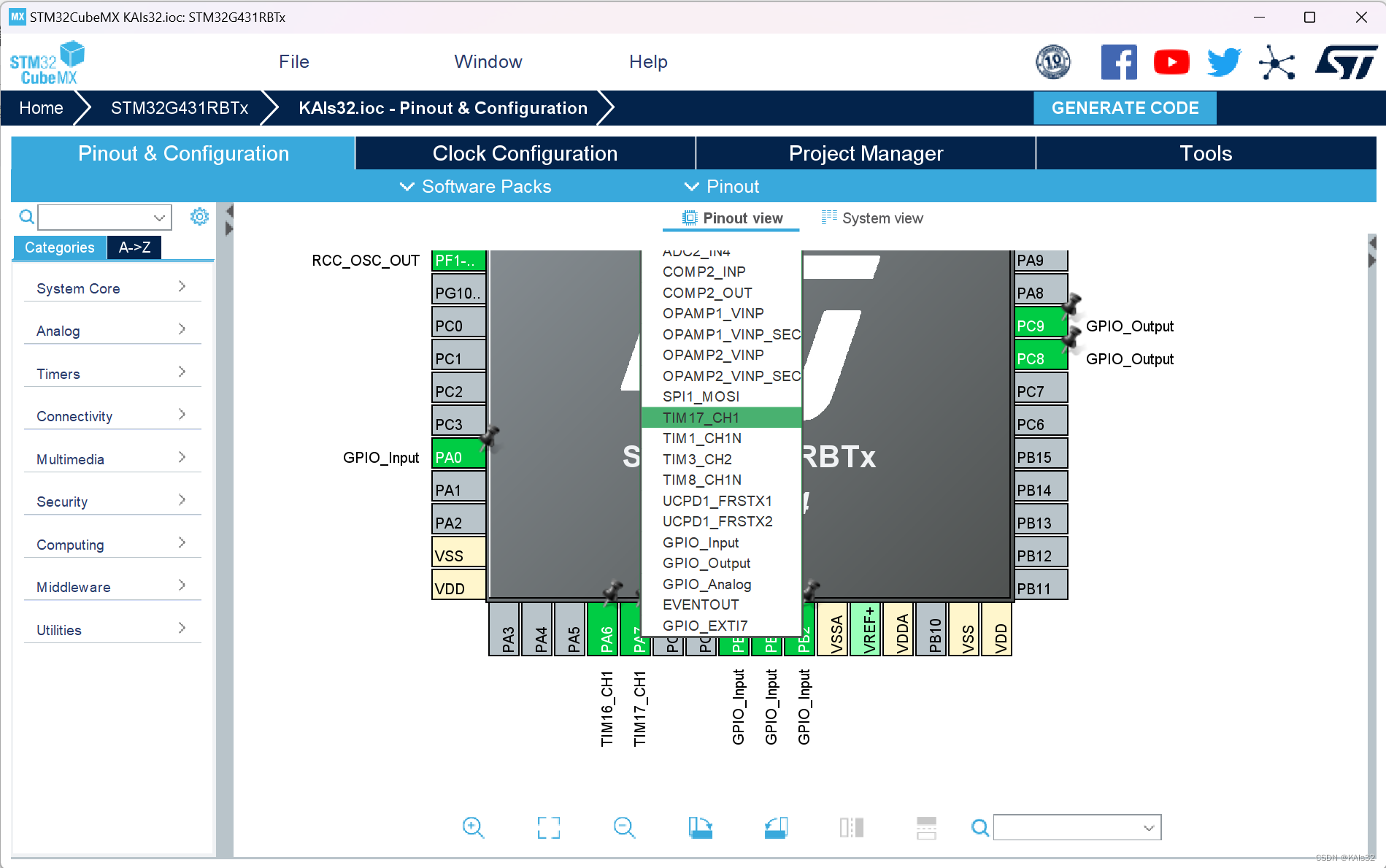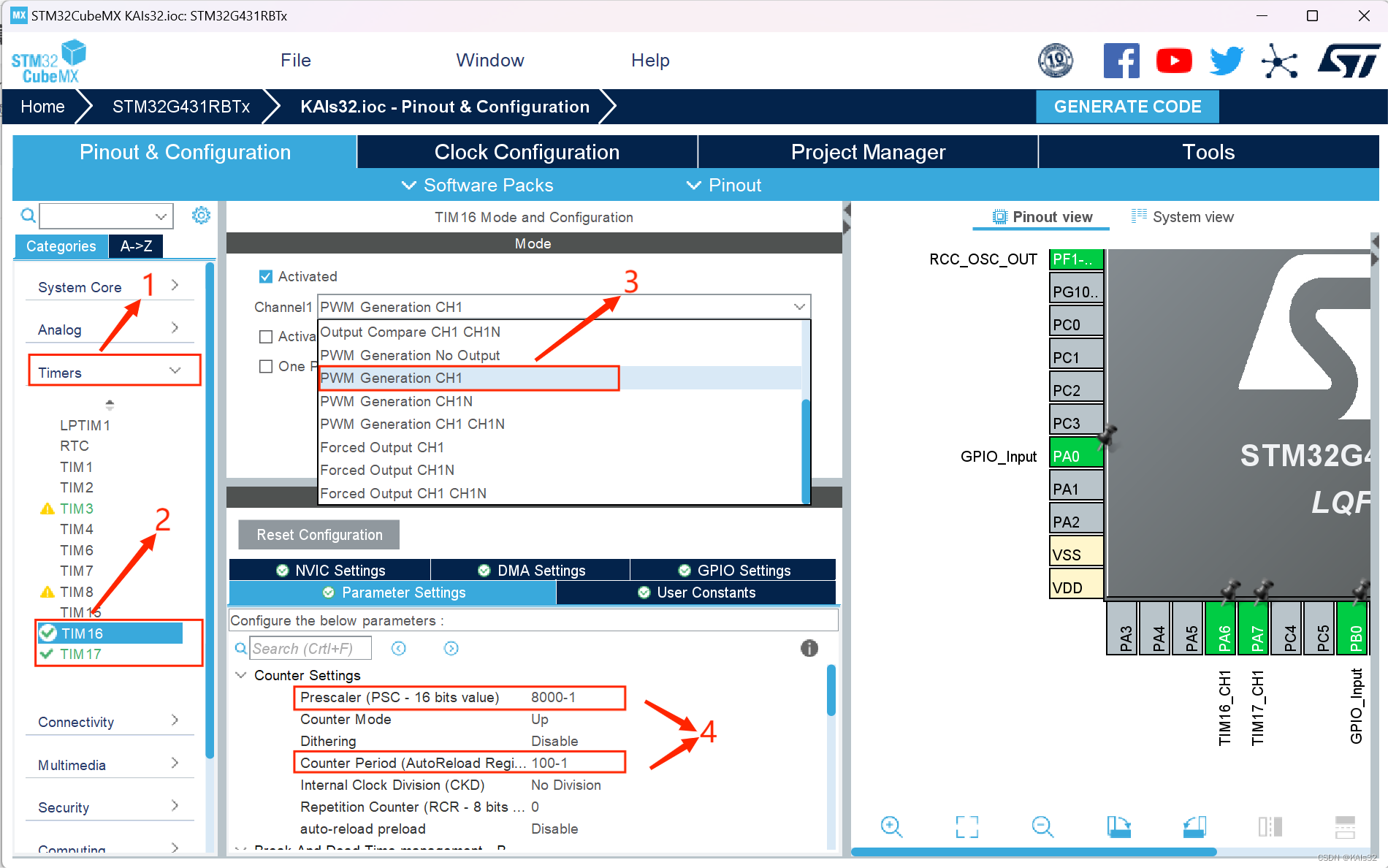 2、点击Timers,选择TIM16、TIM17,勾选Activated打开使能,选择PWM Generation CH1