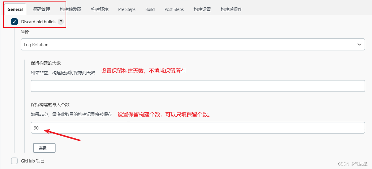 jenkins默认保留构建历史所有,这样磁盘空间越来越小,设置保留个数。