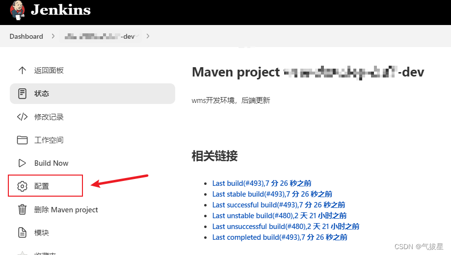 应用保存job配置,并重新构建项目,重新构建完成后会根据保留设置,删除多余的个数和天数的构建历史。勾选Discard old builds,设置保留天数和个数,可以只填保留个数。jenkins默认保留构建历史所有,这样磁盘空间越来越小,设置保留个数。进入job项目中-配置。