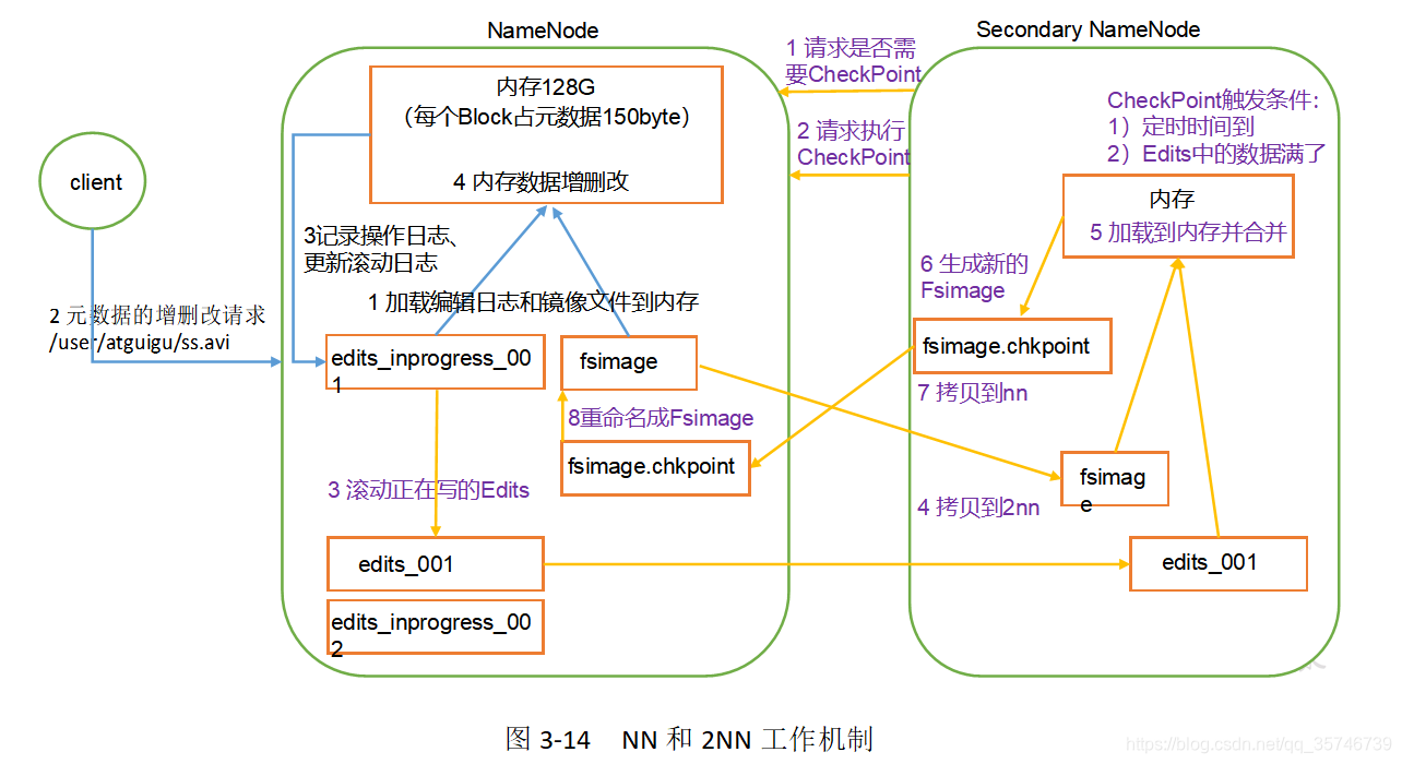 NameNode启动时,先滚动Edits并生成一个空的edits.inprogress,然后加载Edits和Fsimage到内存中,此时NameNode内存就持有最新的元数据信息。Client开始对NameNode发送元数据的增删改的请求,这些请求的操作首先会被记录到edits.inprogress中(查询元数据的操作不会被记录在Edits中,因为查询操作不会更改元数据信息),如果此时NameNode挂掉,重启后会从Edits中读取元数据的信息。然后,NameNode会在内存中执行元数据的增删改的操作。