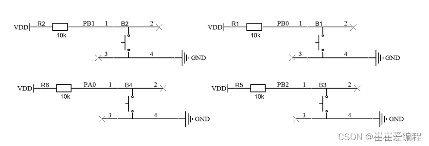 本文主要介绍硬件平台上按键的使用,板子上共有5个按键,最左边一列,最上边是复位按键,用户可编程的按键是下面4个(原理图如下),分别为B1,B2,B3,B4,其分别与以下IO口对应PB0,PB1,PB2,PA0
