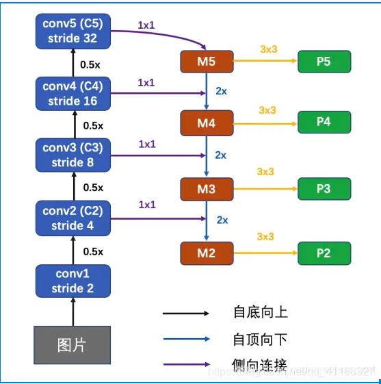 我们可以看到FPN的整体结构分为 自底向上和 自顶向下和侧向连接的过程。接下来我们分别解释一下这两个关键部分。
