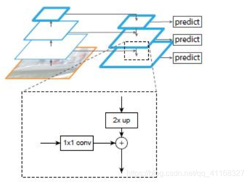 作者采用的方法,就是将上层的feature map上采样到2倍,然后跟经过1*1 conv的相邻下层feature map直接相加。