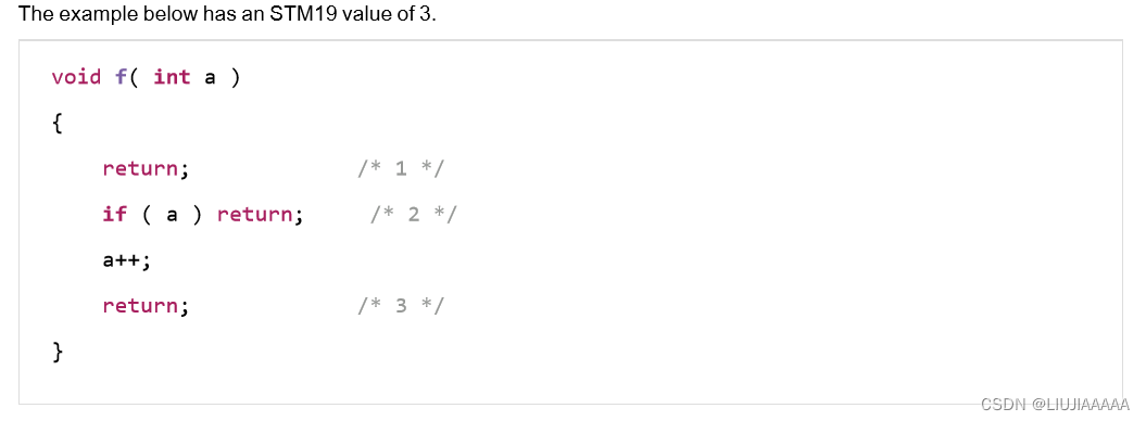 4.1概念:这个度量是对软件中退出点数量的度量,通过计算返回语句来计算。没有返回语句的函数STM19值为0。这个函数是否声明有返回值无关(即返回void)。