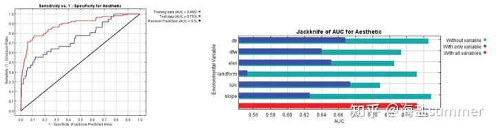 基于MaxEnt模型生成的AUC数据,对模型运行的性能进行可信度、适配度检验,解释和调整Maxent曲线下的面积值和可变贡献。