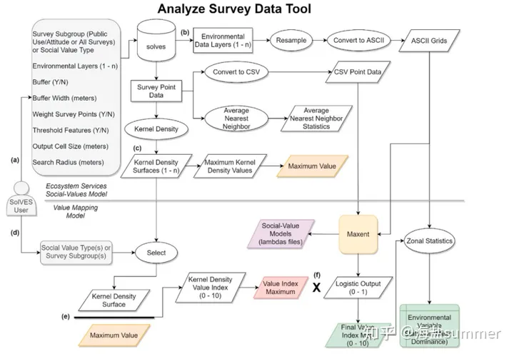 本内容将讲述用于评估生态系统服务功能社会价值的SolVES模型及其原理,通过本文将学会SolVES模型的原理与运行方法:如何将收集的社会调查数据导入数据库(SQL),结合受访者分配给各社会价值类型的金额总和(即权重指数),如何利用内嵌的核密度分析工具对标注的社会价值点做加权核密度分析,得到“核密度曲面”及“最大栅格值”;如何利用镶嵌在SolVES模型中的“平均最近邻统计”工具统计社会价值点的聚类空间分布状况;如何利用模型将“核密度曲面”除以“最大栅格值”,并将其结果标准化为“价值指数曲面”;如何结合环境变量数据,启动MaxEnt最大熵模型预测社会价值点的空间分布,实现社会价值的制图。