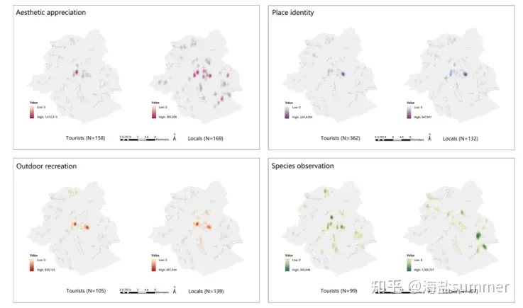 l 利用SolVES 模型对问卷收集到被受访者赋予到每种社会价值上的假定分值进行统计整合,生成具有10点价值指数(value index,VI)的空间显式地图,以此确定各社会价值类型的重要程度。