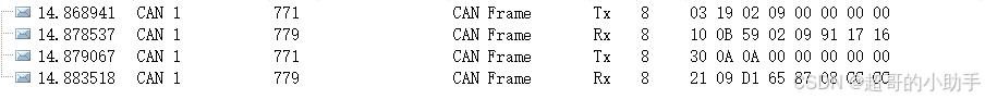 第一帧19:代表19服务 :::DTC的发送请求服务ID标识符为19(一个诊断服务中有多个服务请求,这里DTC的为19)(这里涉及到UDS协议)