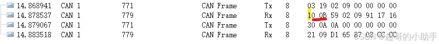 图片中黄色荧光笔标记的1表示该帧数据为连续帧,后续红色标记的00B部分表示数据长度为11;