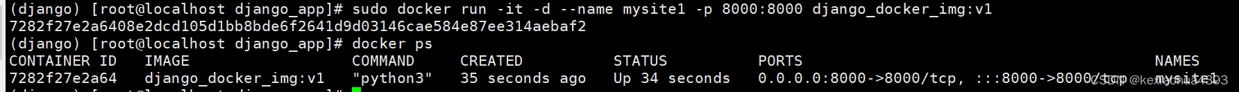 sudo docker run -it -d --name mysite1 -p 8000:8000 -v /root/django_app:/code django_docker_img:v1