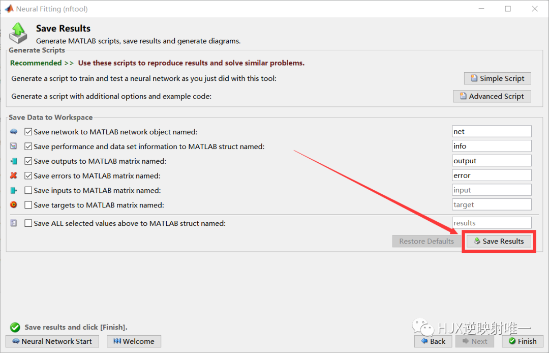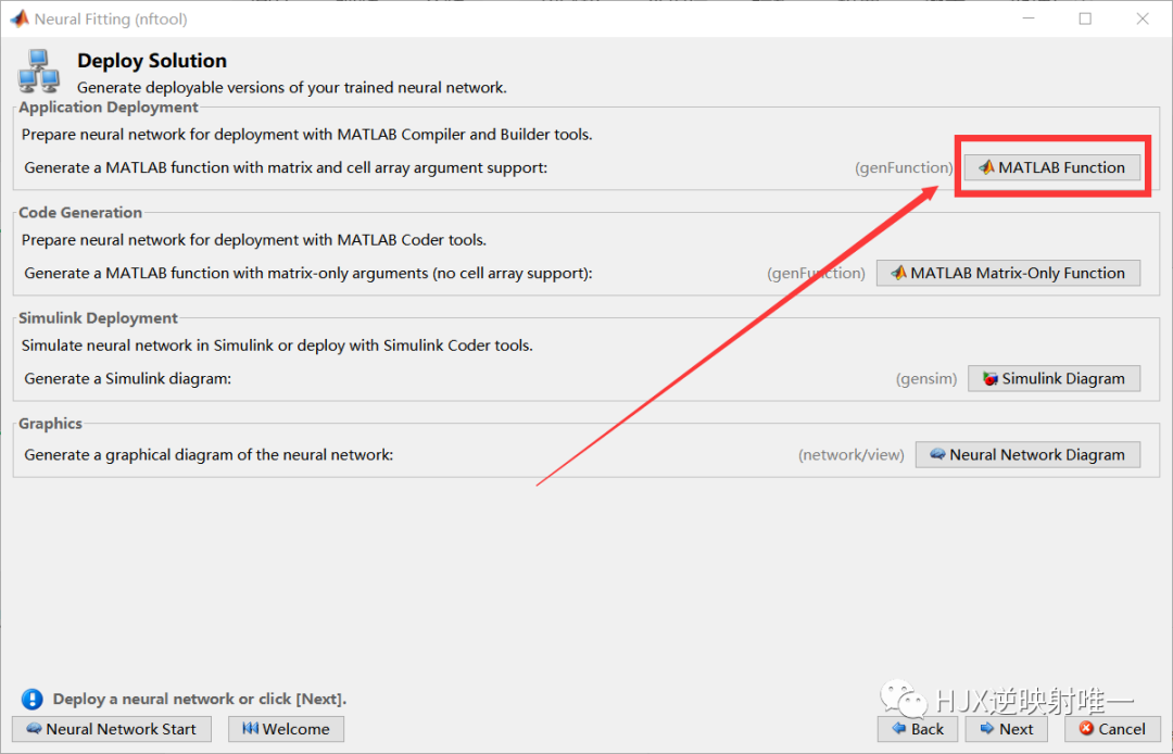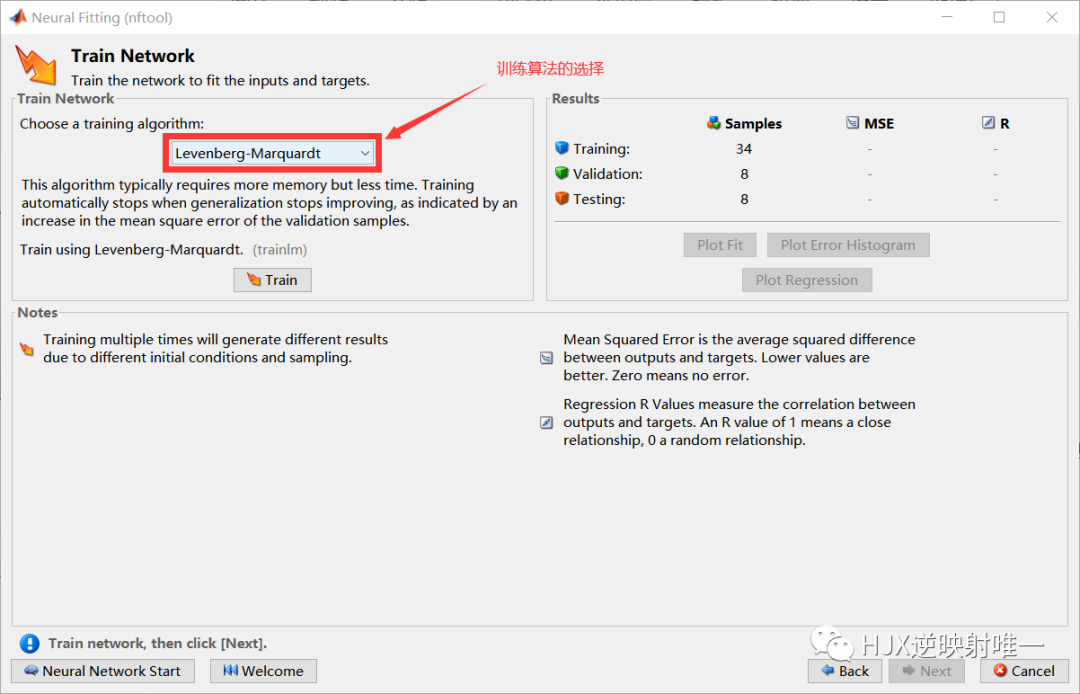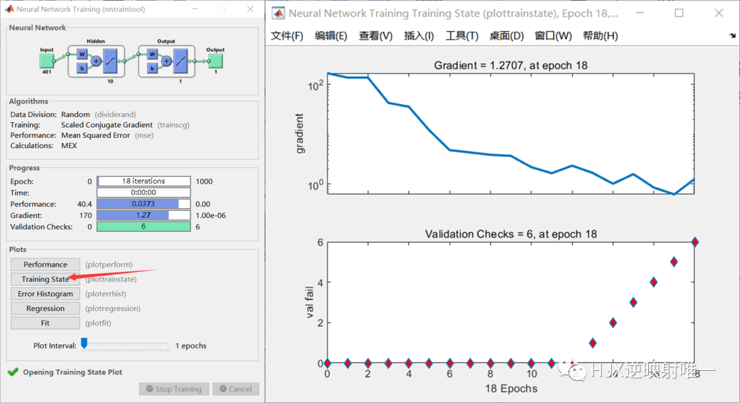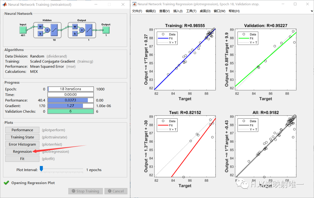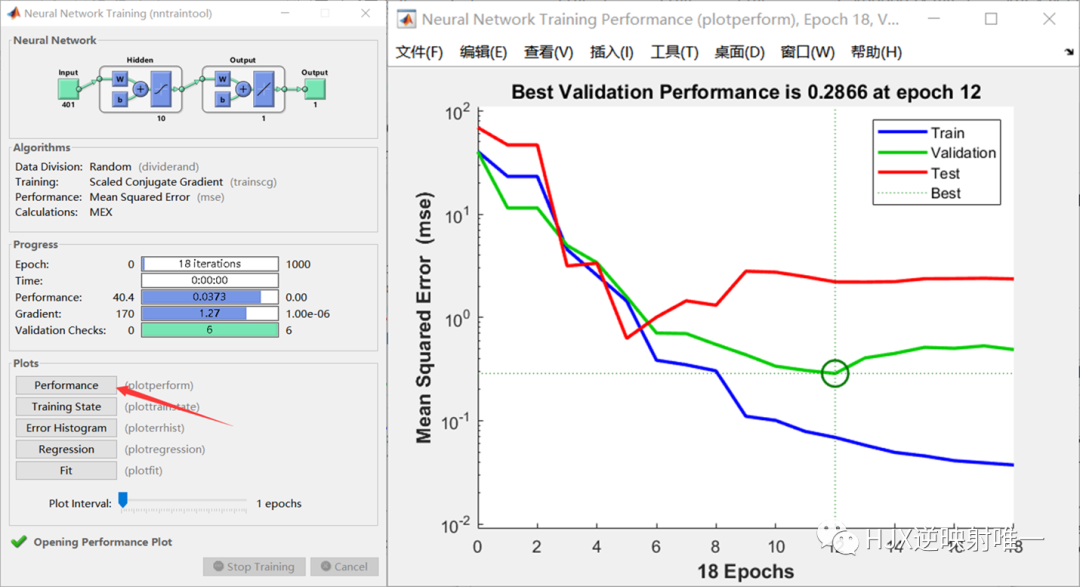 一般是选择默认即可,选择完成后点击<train>按钮后,Matlab就会帮我们训练出一个神经网络模型。