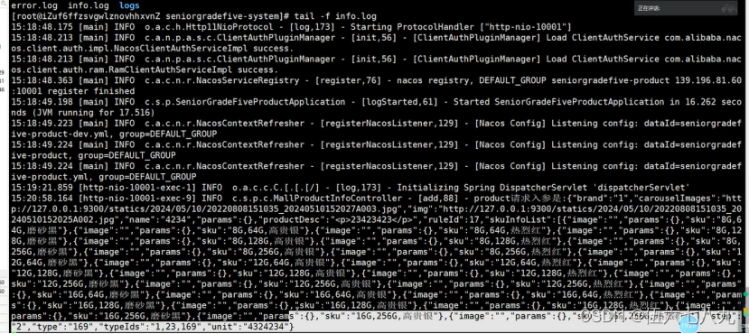 3.按英文格式下n 查找下一个(n表示next) 到了最后一个会自动回到第一个。grep “product”的请求入参” 日志名(grep:文本搜索)1.在如下所示空白处按/后面紧跟需要查找的文件内容 (/代表精准匹配)tail 显示文件末尾内容【日志一般查看最新的所以只需展示末尾日志】后台打印日志(入参建议用json显示打印 避免后期转换问题)再输入/需要查找的日志内容如下所示再按鼠标上下键去查
