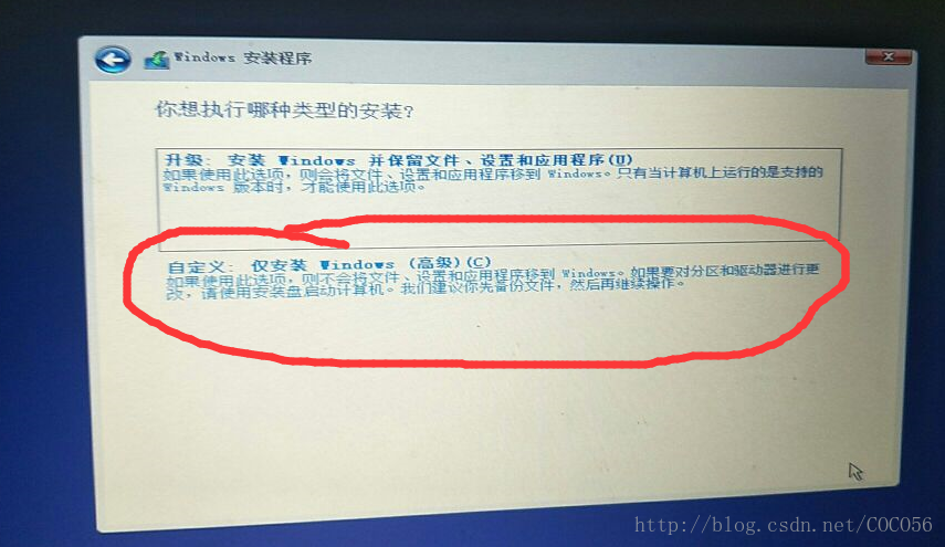 - 选择"自定义: 仅安装windows(高级)"选项