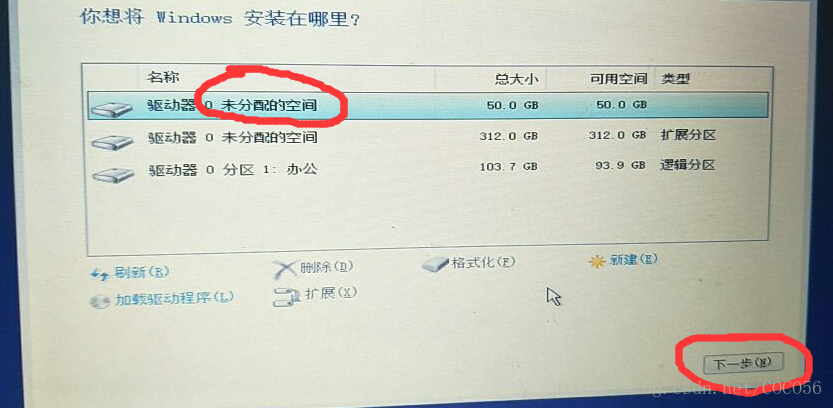- 这时,它会变成未分配的空间,单击它,并随后点击"下一步"