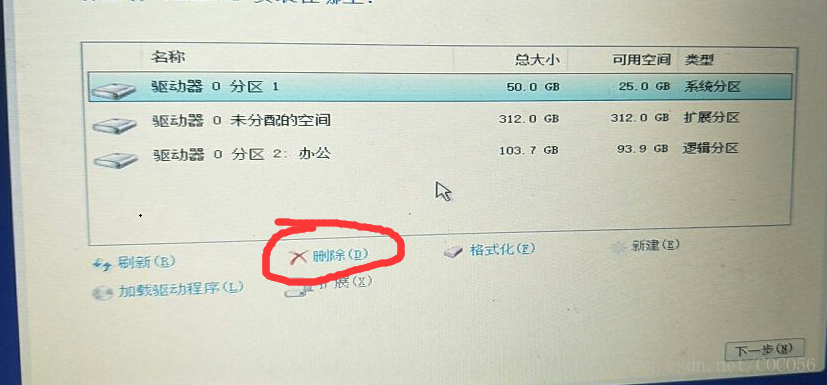 - 找到C盘所对应的驱动器后,单击删除,另外如果您从非win10系统(如win7或win8)升级到win10,那么推荐把位于C盘对应驱动器前的那两个驱动器也都删了,那个一般是引导分区,总大小就几百兆(你电脑上C盘、D盘、E盘啥的应该没有几百兆的吧),这个可以判断出来的。(我的这个截图时已经删过了,之前忘了保存截图了)