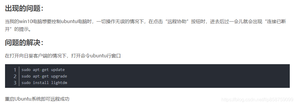 在进行远程协助时遇到了通过Win10客户端控制Ubuntu客户端,以及手机App控制Ubuntu客户端时出现了“连接断开”和“正在进入远程桌面”的提示。经过一番痛苦的搜索,终于在https://blog.csdn.net/weixin_45085810/article/details/105574360?depth_1-utm_source=distribute.pc_relevant.none-task-blog-OPENSEARCH-2&utm_source=distribute.pc_relevant.none-task-blog-OPENSEARCH-2 博客下找到了解决方案: