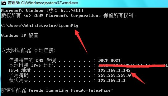 3、在接下来的命令提示符窗口中,输入IPCONFIG的命令,这一步的目的是为了获取电脑上的ip地址,输入命令回车后记好ip。